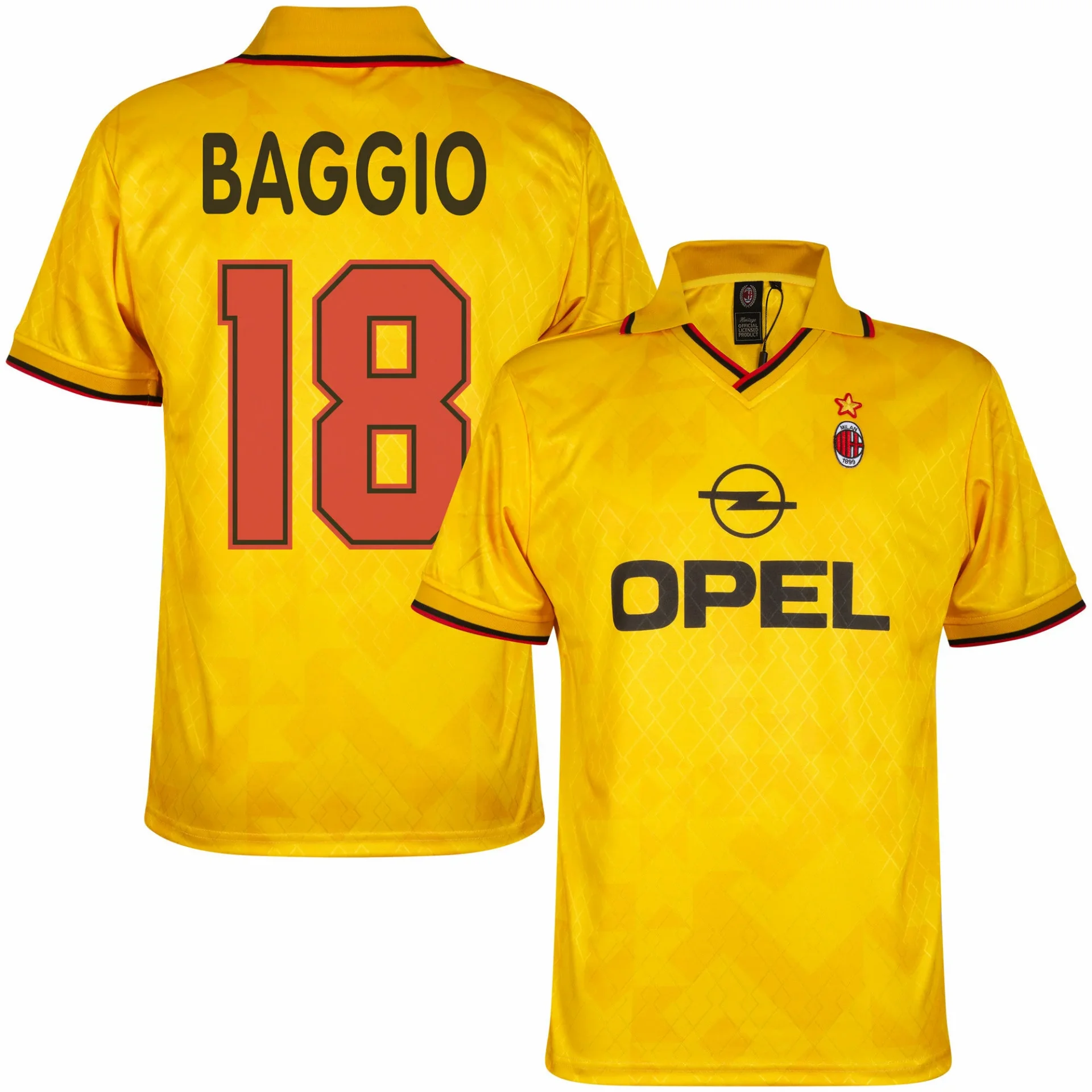 Dit is het officiële AC Milan 3e retro voetbalshirt 1995-1996. De achterkant bevat de bedrukking van BAGGIO (18). Dit Milan retro voetbalshirt is gebaseerd op het derde voetbalshirt van AC Milan uit het seizoen 1995/96. Het retro voetbalshirt is overwegend in het geel. Op het midden staat de naam van de toenmalige sponsor OPEL. De linkerborst bevat het logo van AC Milan met daarboven een gouden ster. Verder is dit AC Milan retro voetbalshirt voorzien van een v-hals en polo kraag met daarop een rood en zwart lijntje. Ook de biesjes bevatten deze kleuren. Heerlijk AC Milan voetbalshirt voor de echte Milan fan! Het AC Milan retro voetbalshirt van COPA Football heeft een normale pasvorm. Materiaal: 100% gerecycled polyester.
