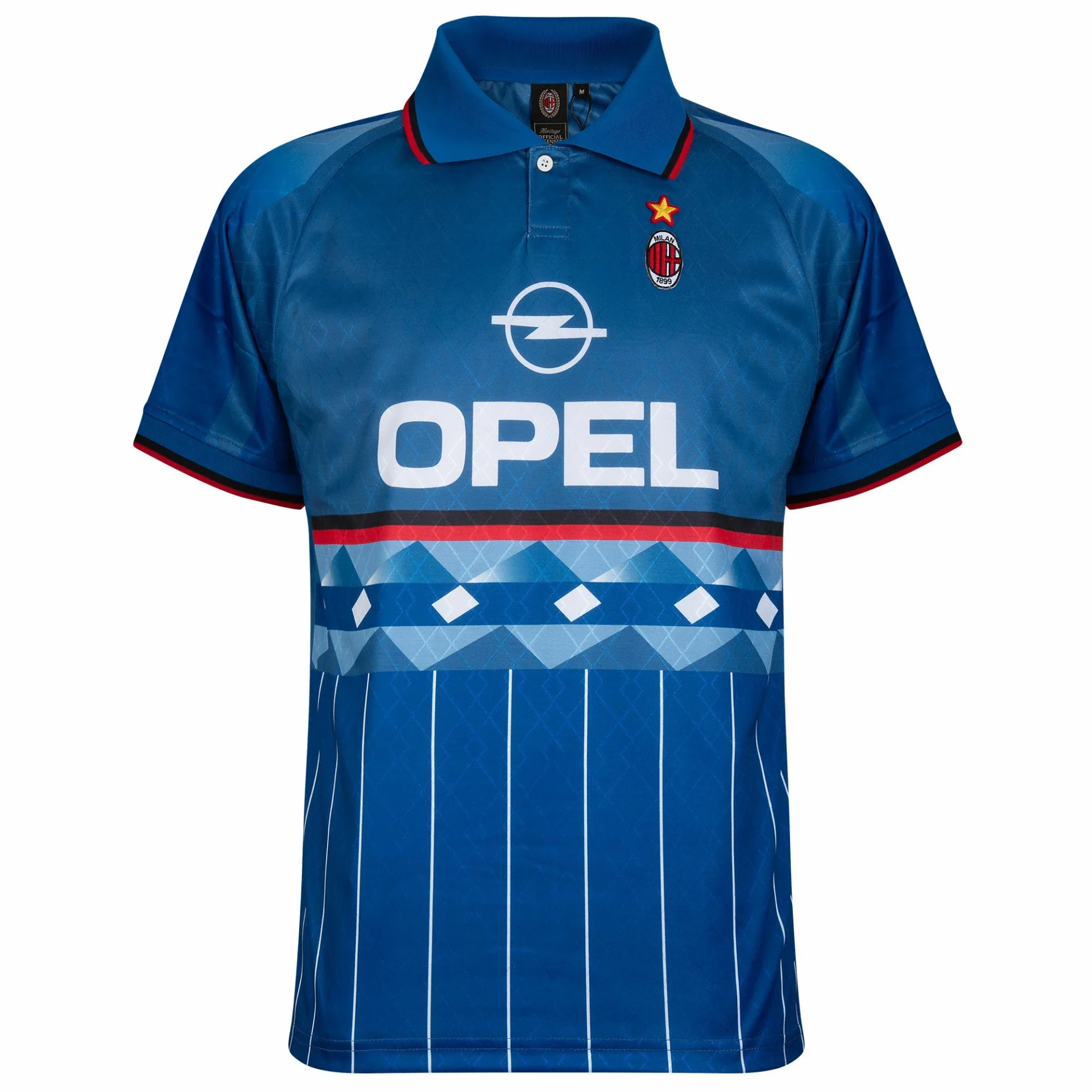 Dit is het officiële AC Milan 4e retro voetbalshirt 1995-1996. Dit Milan retro voetbalshirt is gebaseerd op het vierde voetbalshirt van AC Milan uit het seizoen 1995/96. Het retro voetbalshirt is overwegend in het blauw. Op het midden staat de naam van de toenmalige sponsor OPEL. De linkerborst bevat het logo van AC Milan met daarboven een gouden ster. De onderkant van het retro voetbalshirt is voorzien van dunne witte streepjes. Verder is dit AC Milan retro voetbalshirt voorzien van een hals met knoopje en een blauwe polo kraag met daarop een rood en zwart lijntje. Ook de biesjes bevatten deze kleuren. Heerlijk AC Milan voetbalshirt voor de echte Milan fan! Het AC Milan retro voetbalshirt van Score Draw heeft een normale pasvorm. Materiaal: 100% gerecycled polyester.