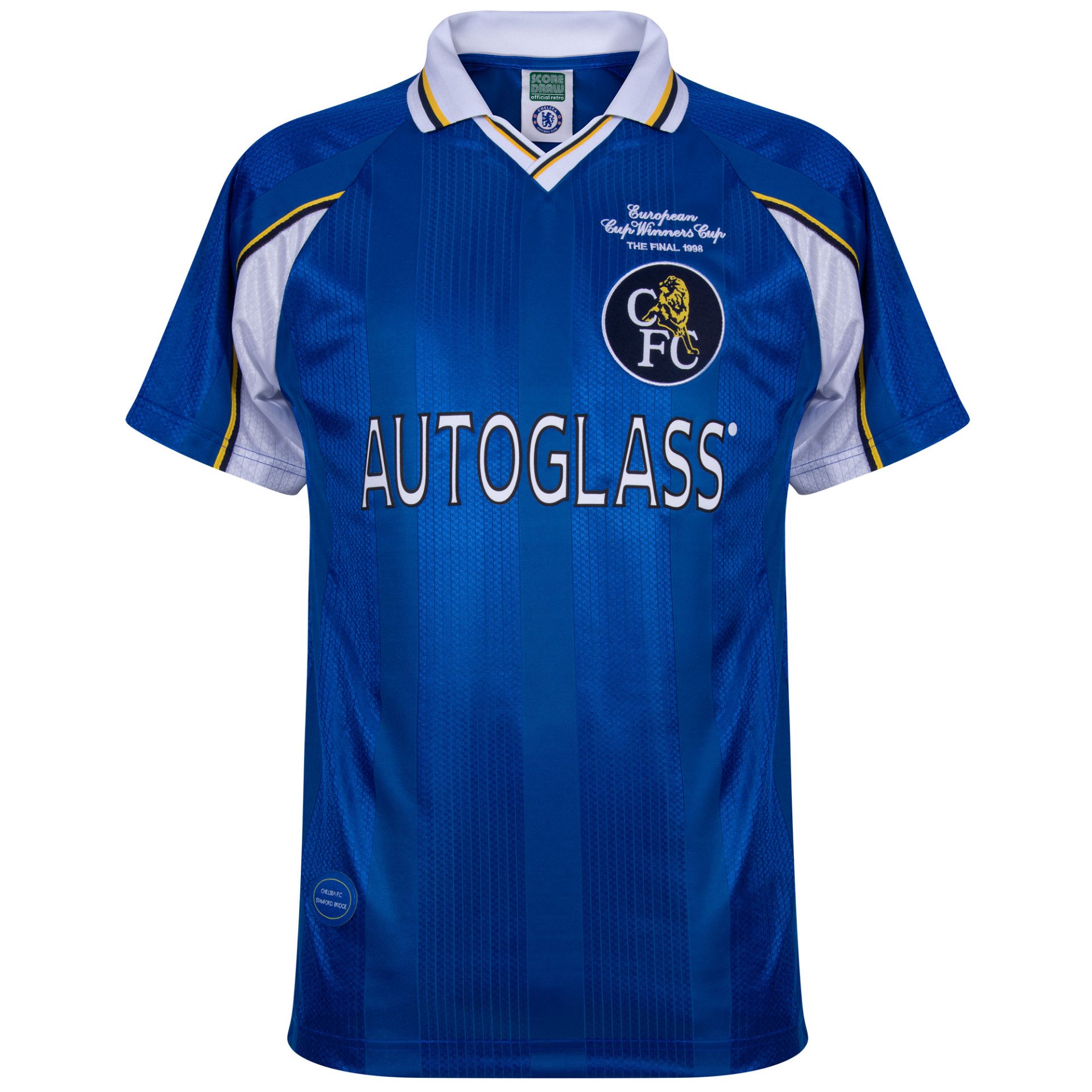 Centraal op de borst staat de historische sponsor AUTOGLASS. Op de linkerborst bevindt zich het clubembleem van Chelsea, met daarboven de tekst European Cup Winners Cup The Final 1998. Deze speciale vermelding herdenkt de gewonnen finale tegen Stuttgart. Het comfortabele polyester materiaal zorgt voor een prettige pasvorm en langdurig draagcomfort.