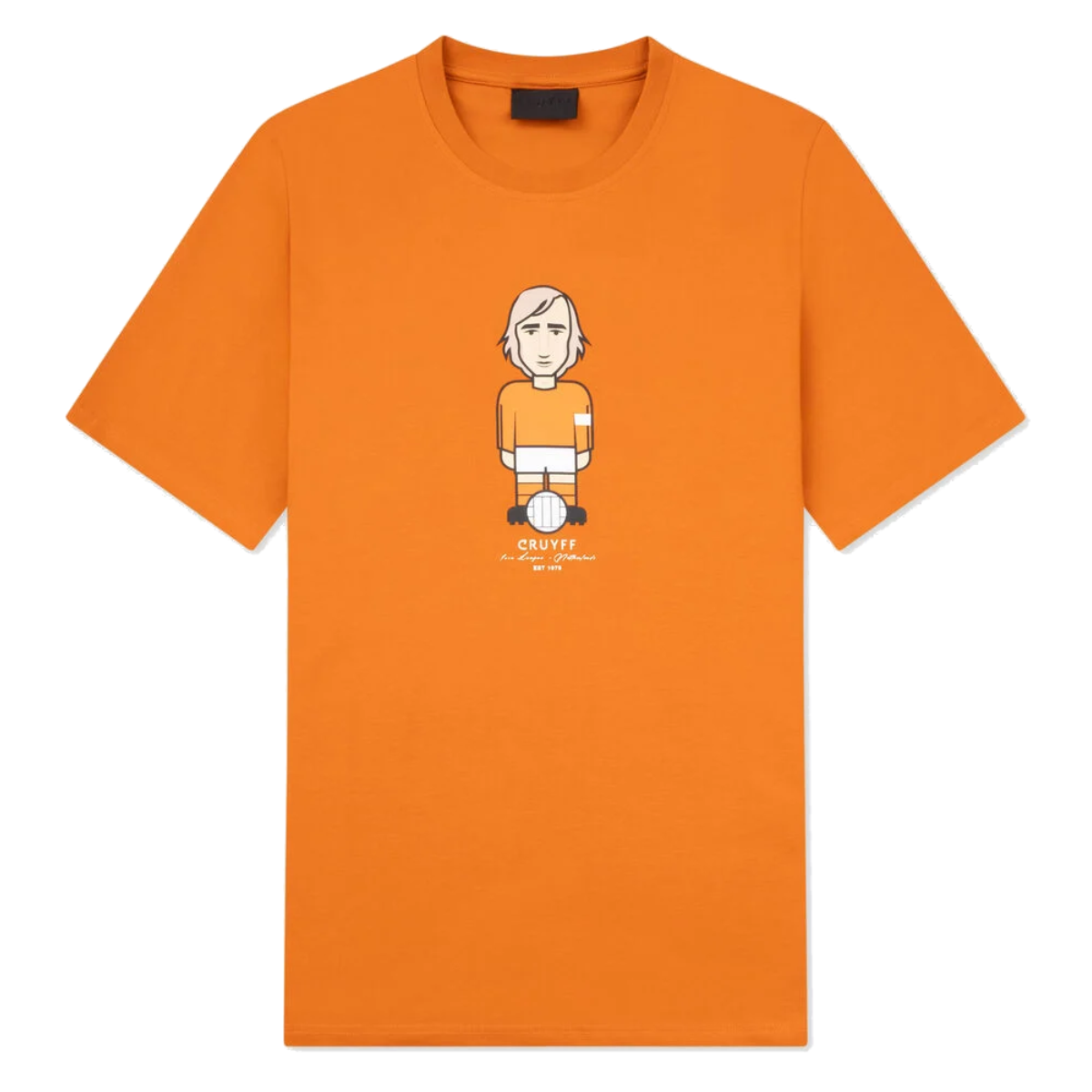 Op de voorkant van het T-shirt staat een opvallende graphic print van Johan Cruijff in het tenue van het Nederlands Elftal. Een krachtig design dat direct verwijst naar zijn invloed op het internationale voetbal. Cruijff maakte zijn debuut voor Nederland in 1966 en speelde in totaal 48 interlands, waarin hij maar liefst 33 keer scoorde. Met zijn briljante spel tijdens het WK 1974 leidde hij Nederland naar de finale en schreef hij geschiedenis.