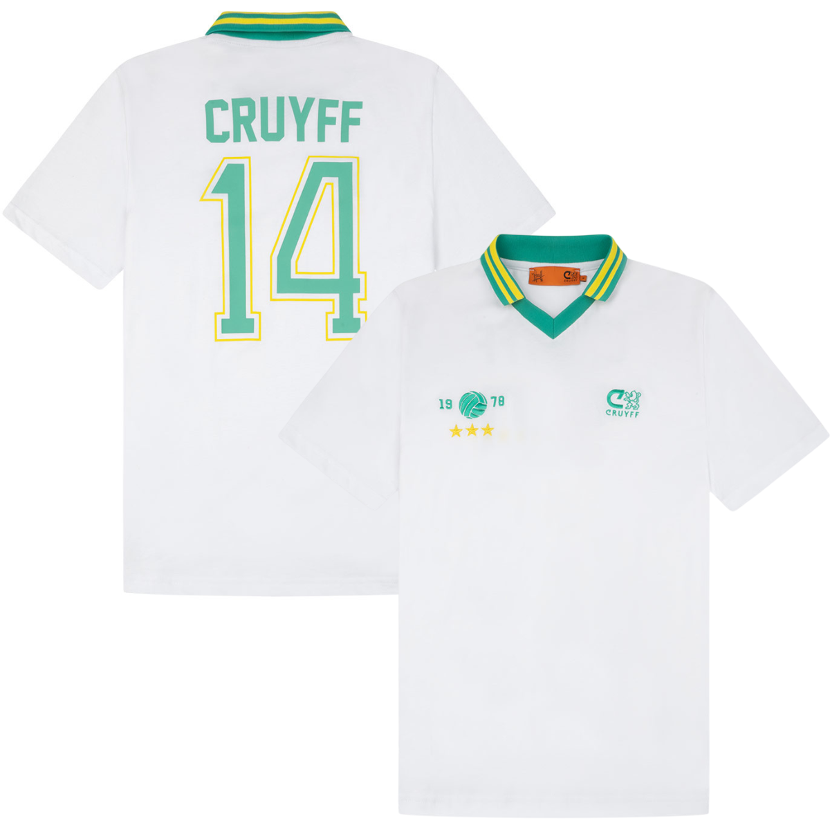 Het design combineert een klassieke witte basis met opvallende groene en gele details. De groene V-hals en polokraag met subtiele gele strepen geven het shirt een authentieke vintage uitstraling. Op de achterkant is het iconische rugnummer 14 verwerkt. De rechterborst bevat drie sterren met het jaartal 1978 en een retro bal, terwijl op de linkerborst het herkenbare Cruyff logo is aangebracht.