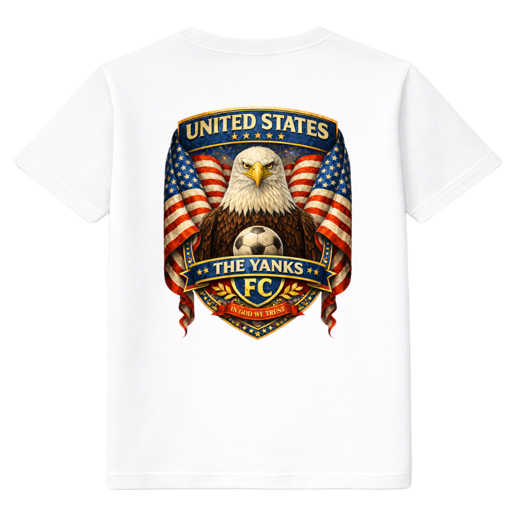 Gaaf Verenigde Staten voetbal T-shirt van FC ELEVEN voor volwassenen. Het heavy T-shirt is gemaakt van zwaar biologisch katoen. Kenmerkend voor dit T-shirt is de kleurrijke graphic print van de Verenigde Staten op de rug. Op de print staan de teksten The Yanks en United States, met in het midden een Amerikaanse zeearend. Op de linkerborst bevinden zich de initialen FC in zwart als siliconen logo. Het heavy T-shirt is volledig wit en voorzien van een ronde hals. Het T-shirt is gemaakt van zwaar katoen en heeft een normale pasvorm. Materiaal: 100% organisch katoen.