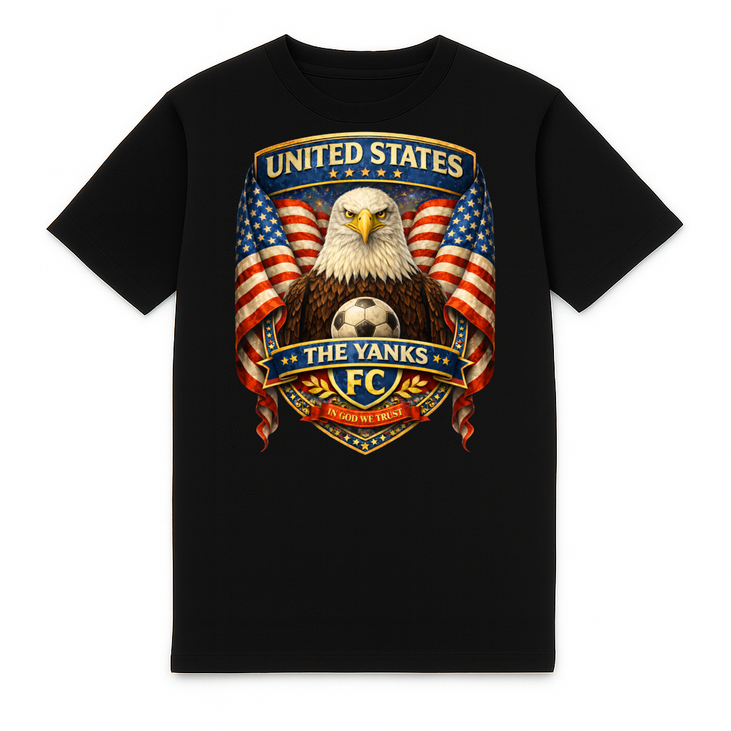 Gaaf Verenigde Staten voetbal T-shirt van FC ELEVEN voor volwassenen. Het heavy T-shirt is gemaakt van zwaar biologisch katoen. Kenmerkend voor dit T-shirt is de kleurrijke graphic print van de Verenigde Staten op de rug. Op de print staan de teksten The Yanks en United States, met in het midden een Amerikaanse zeearend. Op de linkerborst bevinden zich de initialen FC in zwart als siliconen logo. Het heavy T-shirt is volledig zwart en voorzien van een ronde hals. Het T-shirt is gemaakt van zwaar katoen en heeft een normale pasvorm. Materiaal: 100% organisch katoen.