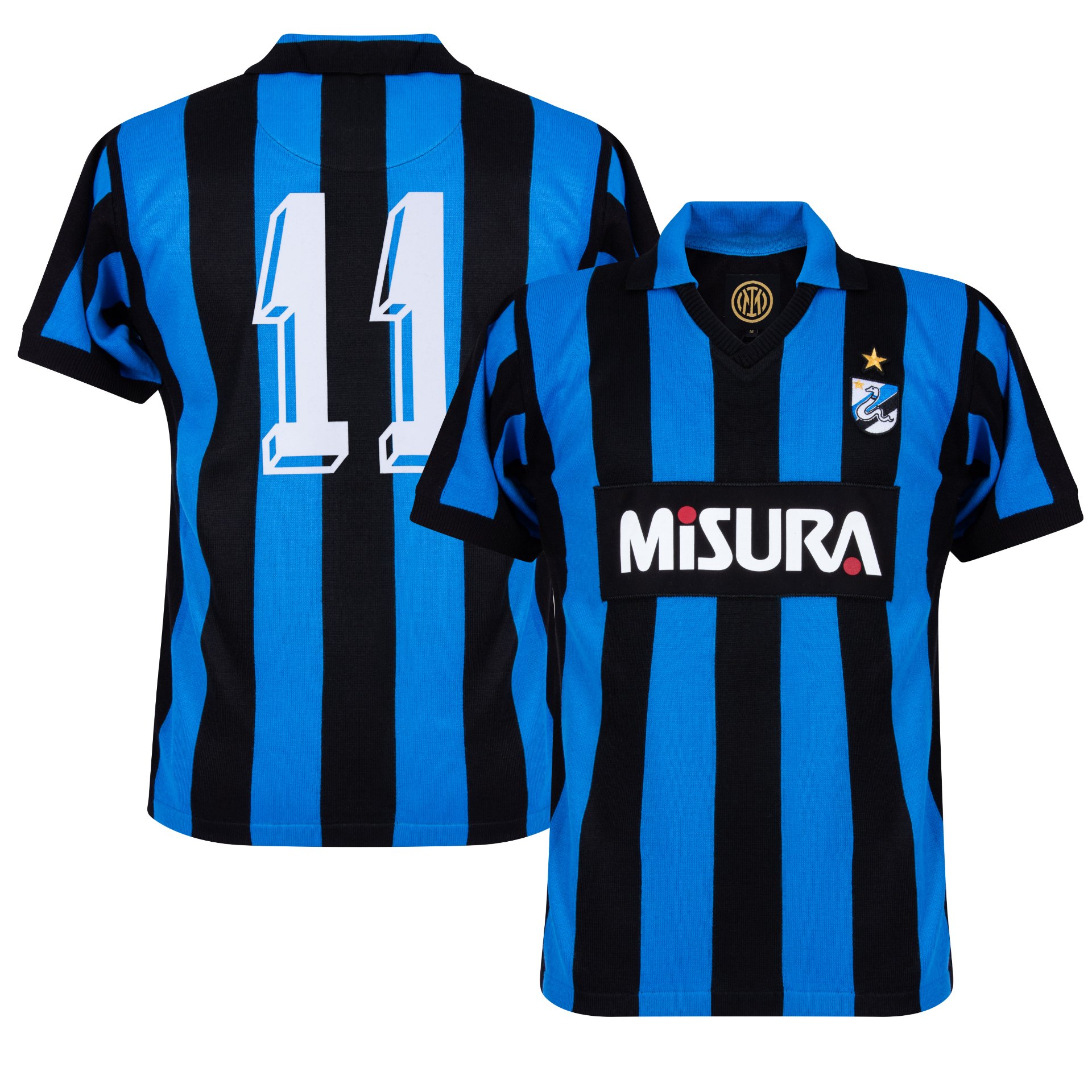 Dit is het officiële Inter Milan 'Mizura' retro voetbalshirt 1986 van COPA Football voor volwassenen. Het retro voetbalshirt is gebaseerd op het thuisshirt van Inter uit het seizoen 1985/86. Het Internazionale voetbalshirt is voorzien van de traditionele blauwe en zwarte strepen. Midden op de borst wordt het retro shirt gekenmerkt door de toenmalige hoofdsponsor MiSURA. Bovendien bevat het shirt een mooie zwarte v-hals en een polo kraag in het blauw met zwart. De linkerborst is voorzien van het logo van Inter Milaan met daarboven de gouden ster. Per 10 kampioenschappen mag een gouden ster aan het logo worden toegevoegd. Gaaf Inter 1986 retro voetbalshirt voor de echte fan! Het COPA Football retro voetbalshirt heeft een normale pasvorm. Materiaal: 100% acryl.