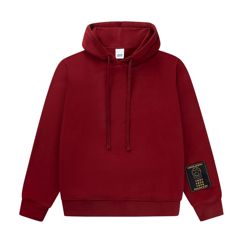 Stijlvolle Johan Cruyff Premium Johan hoodie in de kleur donkerrood voor volwassenen. Deze luxe hoodie is gemaakt van 100% zware Franse badstof en heeft een relaxte pasvorm voor ultiem draagcomfort. Op de linkermouw bevindt zich een bijzondere Ballon d’Or patch, die verwijst naar de jaren 1971, 1973 en 1974 waarin Johan Cruyff deze prestigieuze prijs wist te winnen. Op de rug is een subtiele Johan Cruyff badge aangebracht, wat de hoodie een exclusieve en iconische uitstraling geeft.