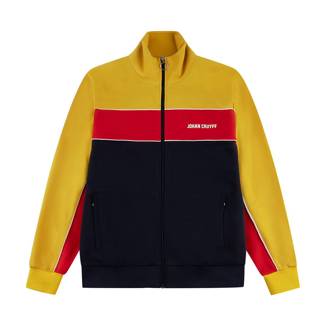 Stijlvol Johan Cruyff retro trainingsjack in de kleuren donkerblauw, rood en geel. Dit luxe trainingsjack heeft een relaxte pasvorm en is ontworpen met oog voor comfort en uitstraling. Het jack is afgewerkt met contrasterende witte biezen en een herkenbare Johan Cruyff print op de linkerborst. De zijzakken met ritssluiting zorgen voor extra gebruiksgemak.