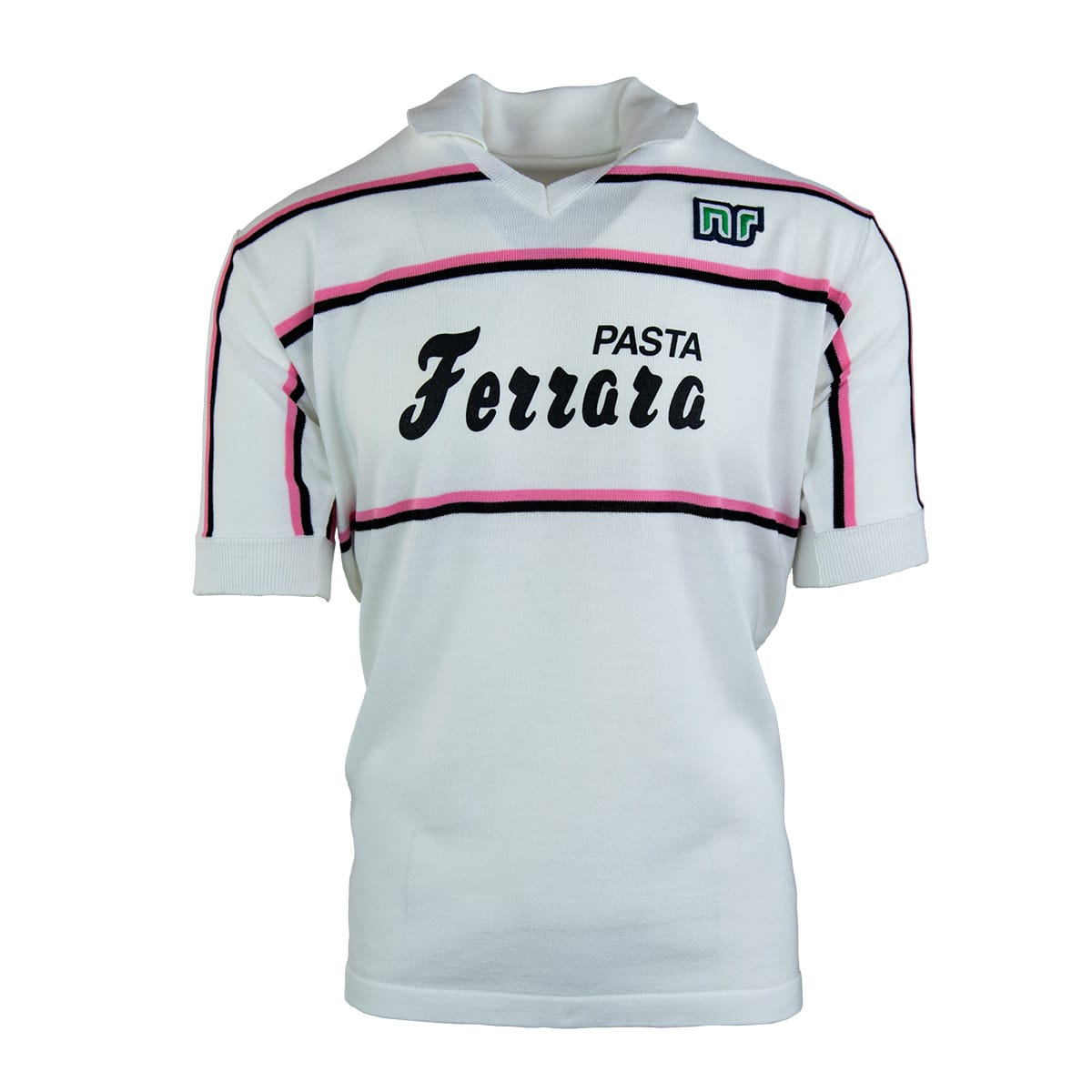 Dit is het officiële Palermo voetbalshirt van Ennerre uit het seizoen 1983/84. Het witte Palermo 'Pasta Ferrara' voetbalshirt betreft het uitshirt van Permo welke gedragen werd gedurende het seizoen 1983-84. Het Palermo voetbalshirt van 'NR' is op dezelfde manier en met dezelfde materialen geproduceerd door Ennerre in Italië als in de jaren '80. Ennerre was ook in de jaren '80 kledingsponsor van onder andere Palermo.